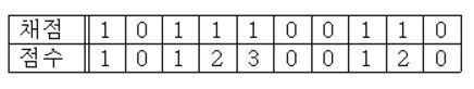 OX 문제는 맞거나 틀린 두 경우의 답을 가지는 문제를 말한다. 여러 개의 OX 문제로 만들어진 시험에서 연속적으로 답을 맞히는 경우에는 가산점을 주기 위해서 다음과 같이 점수 계산을 하기로 하였다. 1번 문제가 맞는 경우에는 1점으로 계산한다. 앞의 문제에 대해서는 답을 틀리다가 답이 맞는 처음 문제는 1점으로 계산한다. 또한, 연속으로 문제의 답이 맞는 경우에서 두 번째 문제는 2점, 세 번째 문제는 3점, ..., K번째 문제는 K점으로 계산한다. 틀린 문제는 0점으로 계산한다. 예를 들어, 아래와 같이 10 개의 OX 문제에서 답이 맞은 문제의 경우에는 1로 표시하고, 틀린 경우에는 0으로 표시하였을 때, 점수 계산은 아래 표와 같이 계산되어, 총 점수는 1+1+2+3+1+2=10 점이다.